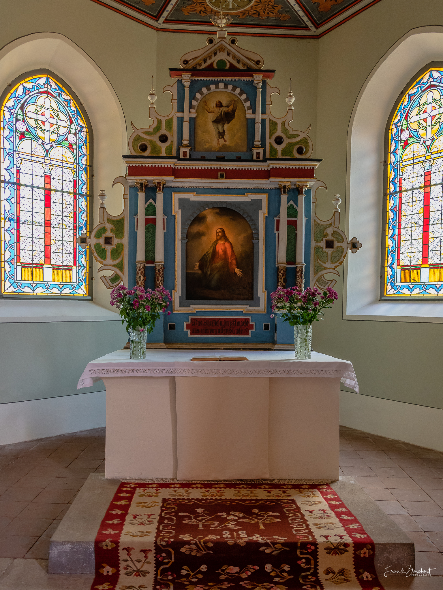 Im Chorraum steht der Altar mit einem hölzernen Aufsatz. Im Hauptfeld des Altarbildes ist Jesus in Gethsemane dargestellt und im oberen Bildteil Christi Himmelfahrt. Besonders schön ist auch die Decke des Chors. Dort ist das Auge Gottes zu sehen, das von Engelsköpfen umgeben ist. Ebenfalls erwähnenswert sind die beiden Buntglasfenster des Altarraums.