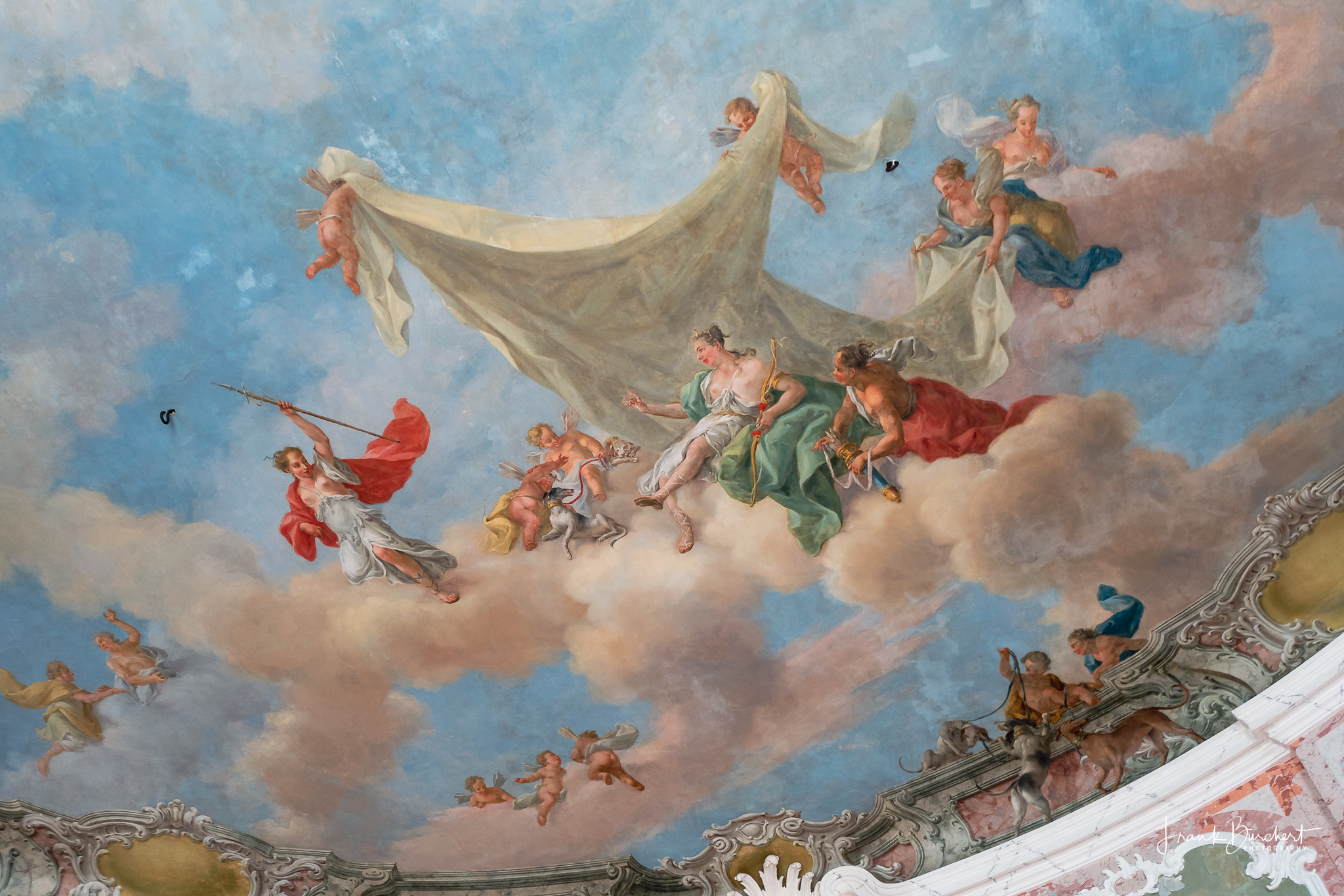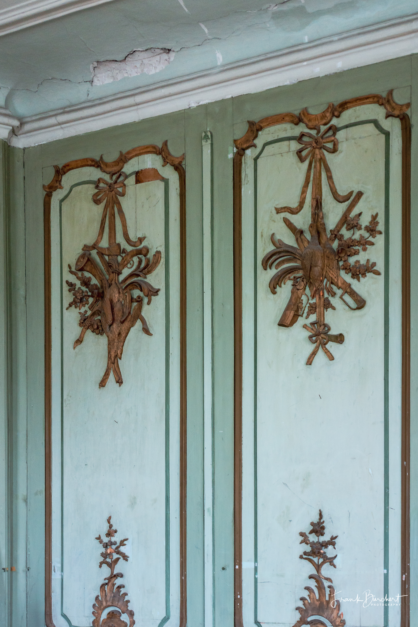 Ein weiterer sehenswerter Raum ist das Jagdzimmer, mit grüner Wandvertäfelung und Schnitzereien, die die Jagd symbolisieren sollen.