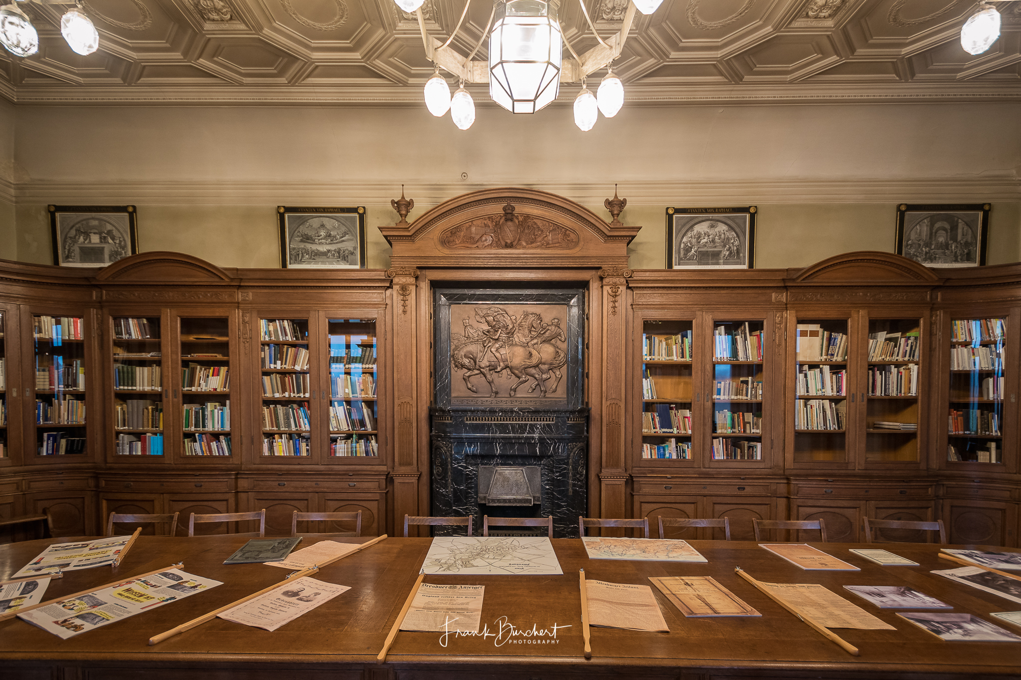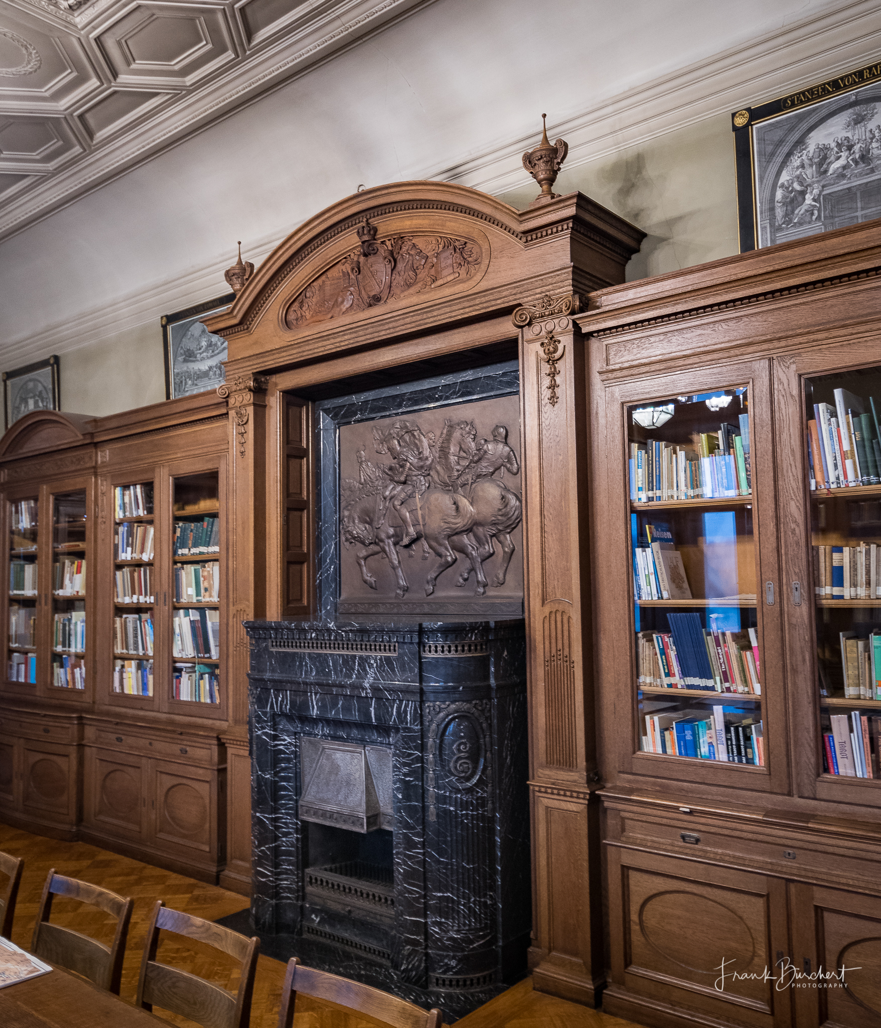 Sehr interessant ist auch die Bildersprache der Bibliothek. Über dem Kamin hängt ein Bronzerelief, das den Sächsischen Prinzenraub von 1455 thematisiert. Weiterhin symbolisieren die beiden Giebeln über der nördlichen und südlichen Eingangstür die Welt des Buches. Eine weibliche Figur steht für die unterhaltsame Belletristik. Eine männliche für die bildende Fachliteratur. Und wer genau hinschaut, kann noch weitere Allegorien in der Bibliothek entdecken, z.B. in den Fensternischen.