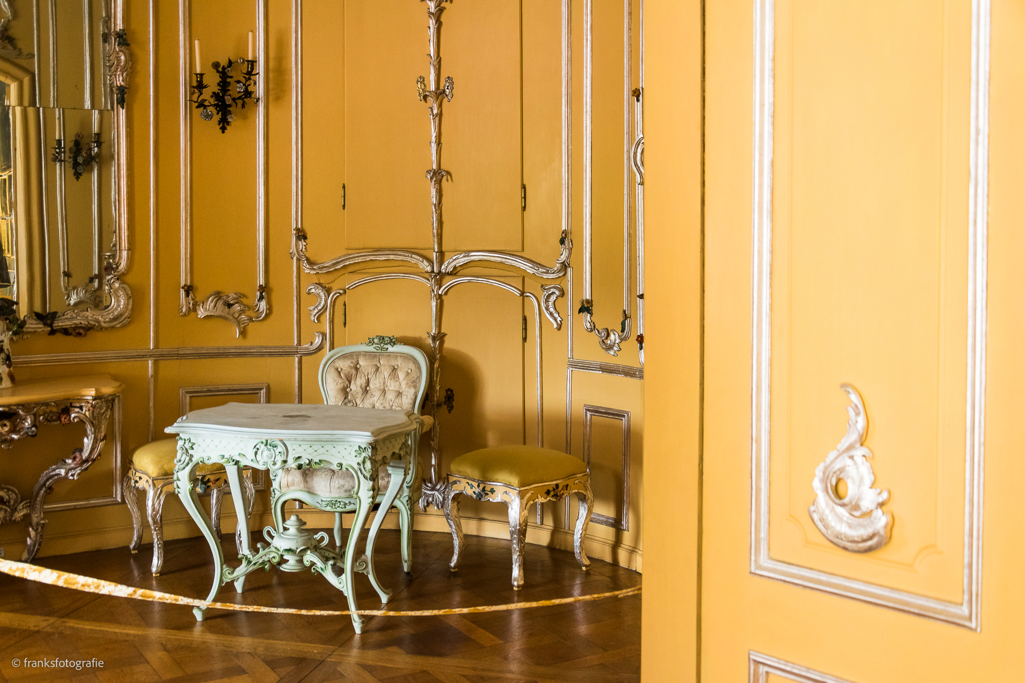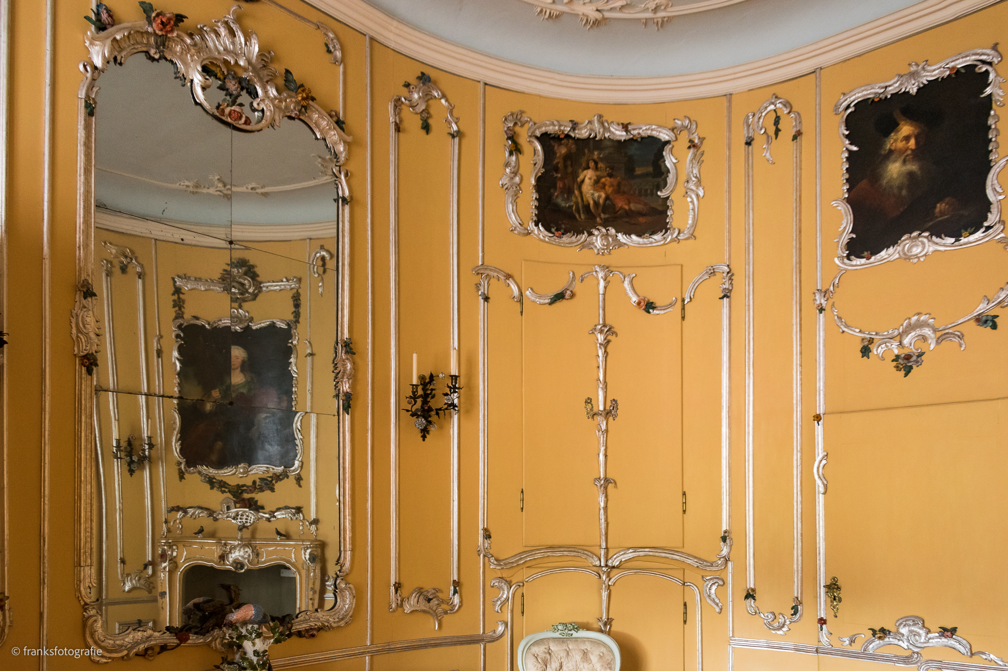 Der Name des Kabinetts verweist auf seine farbliche Ausgestaltung. Denn Profilleisten, Schnitzereien und Rocaillen in einem Silberton heben sich wohltuend von der strohgelben Farbe der Wände ab. Besonders schön sind die Wandleuchter mit den schmückenden Porzellanblumen.