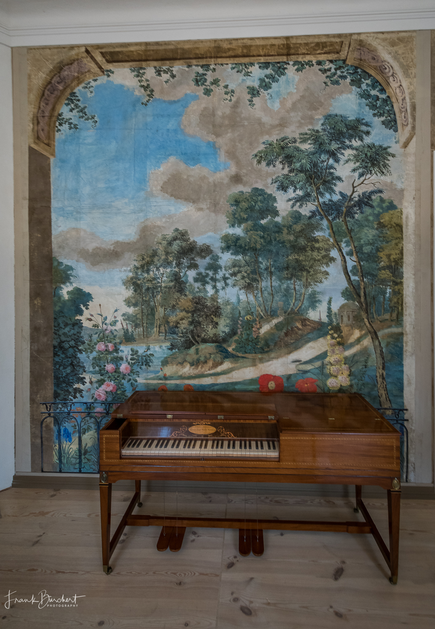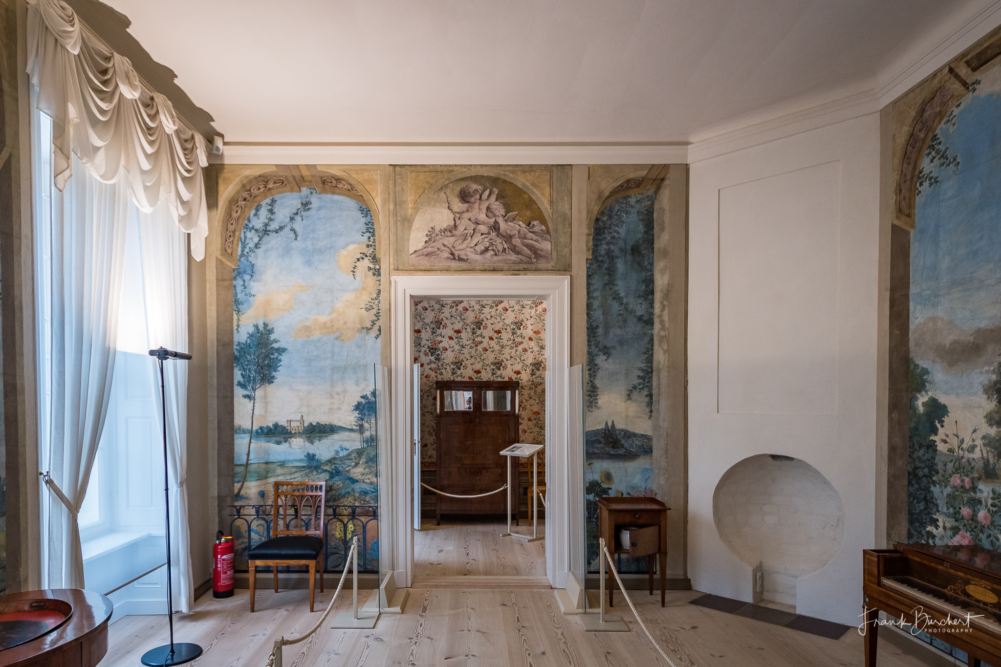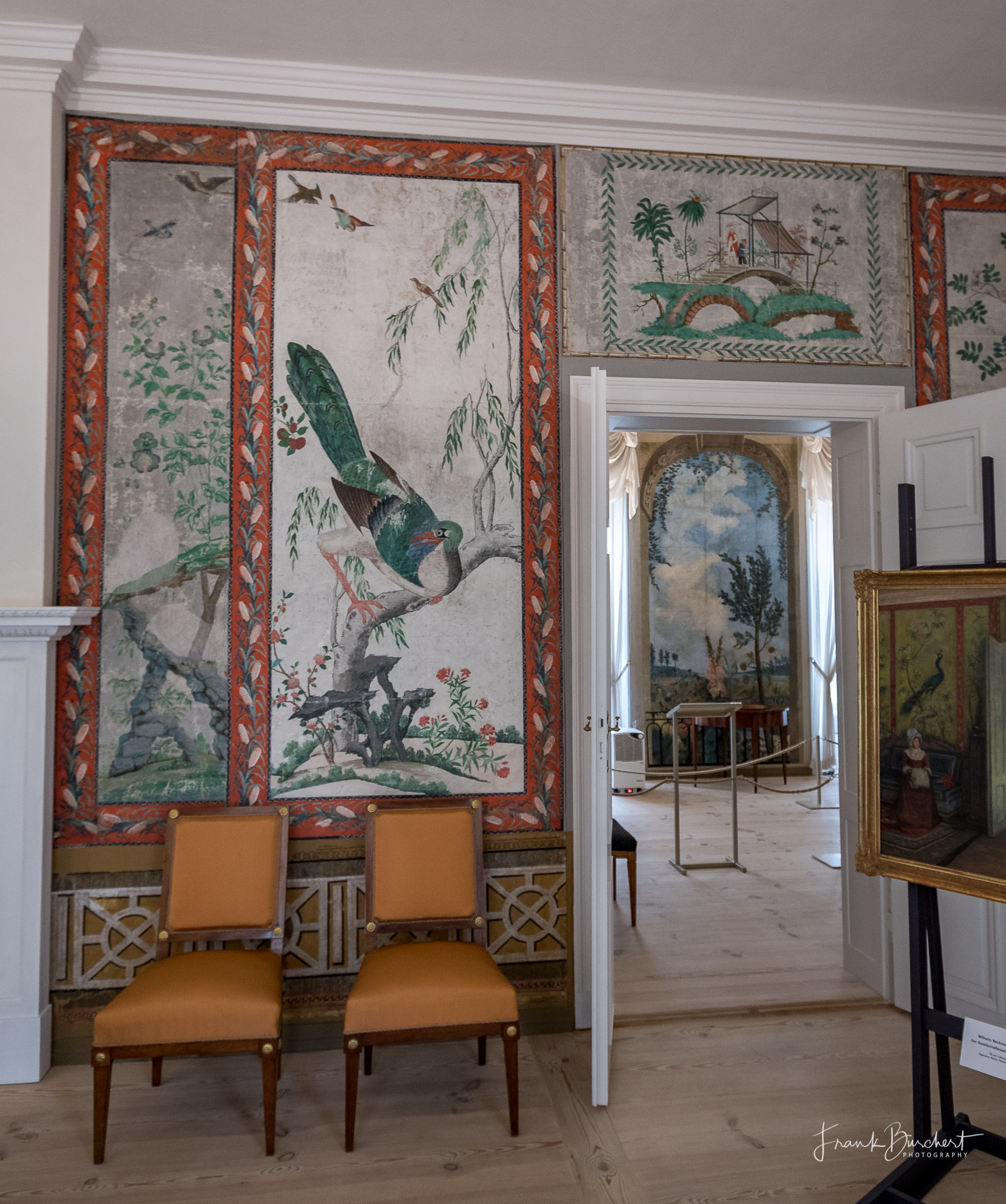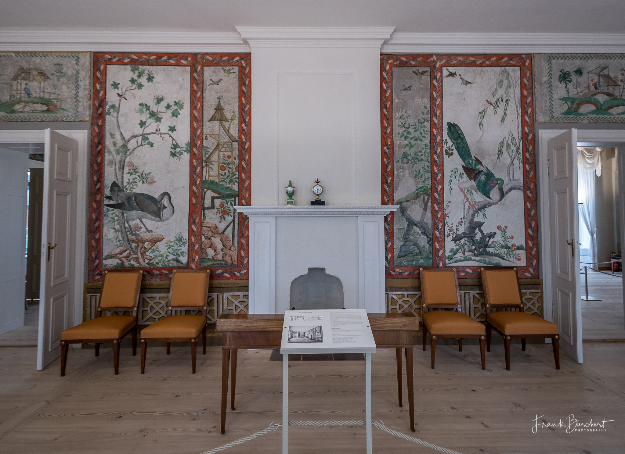 Der Raum ist prachtvoll mit bedruckten Tapeten ausgestattet, die Landschaften darstellen. Bei genauerem Hinsehen kann man Gebäude aus der Potsdamer Kulturlandschaft erkennen. So das Marmorpalais am Heiligen See in Potsdam oder das Schloss auf der Pfaueninsel. Die Tapeten sind so gestaltet, dass man beim betrachten den Eindruck gewinnt, man trete auf einen Balkon, um in die offene Landschaft zu schauen. Wunderschön!