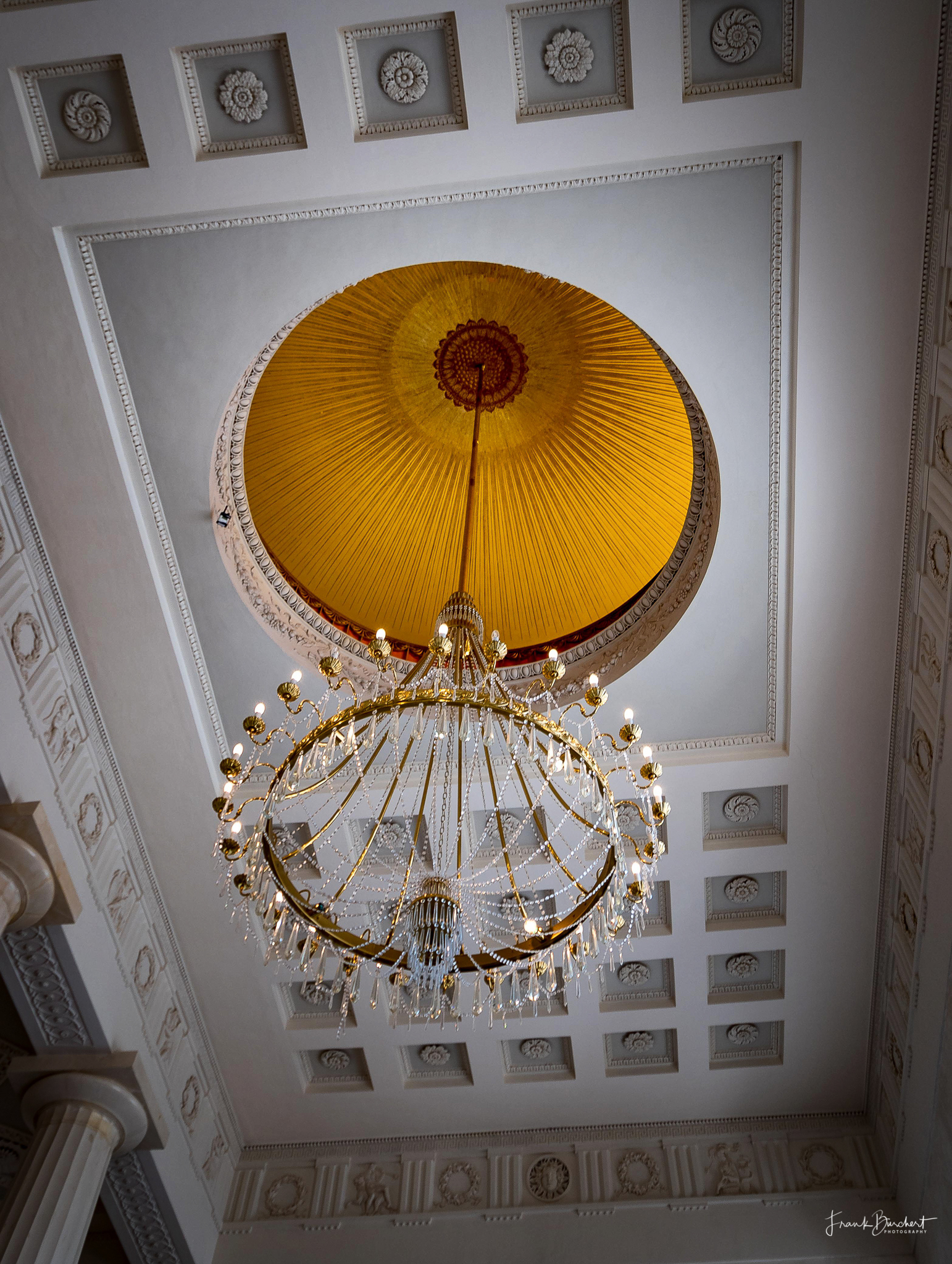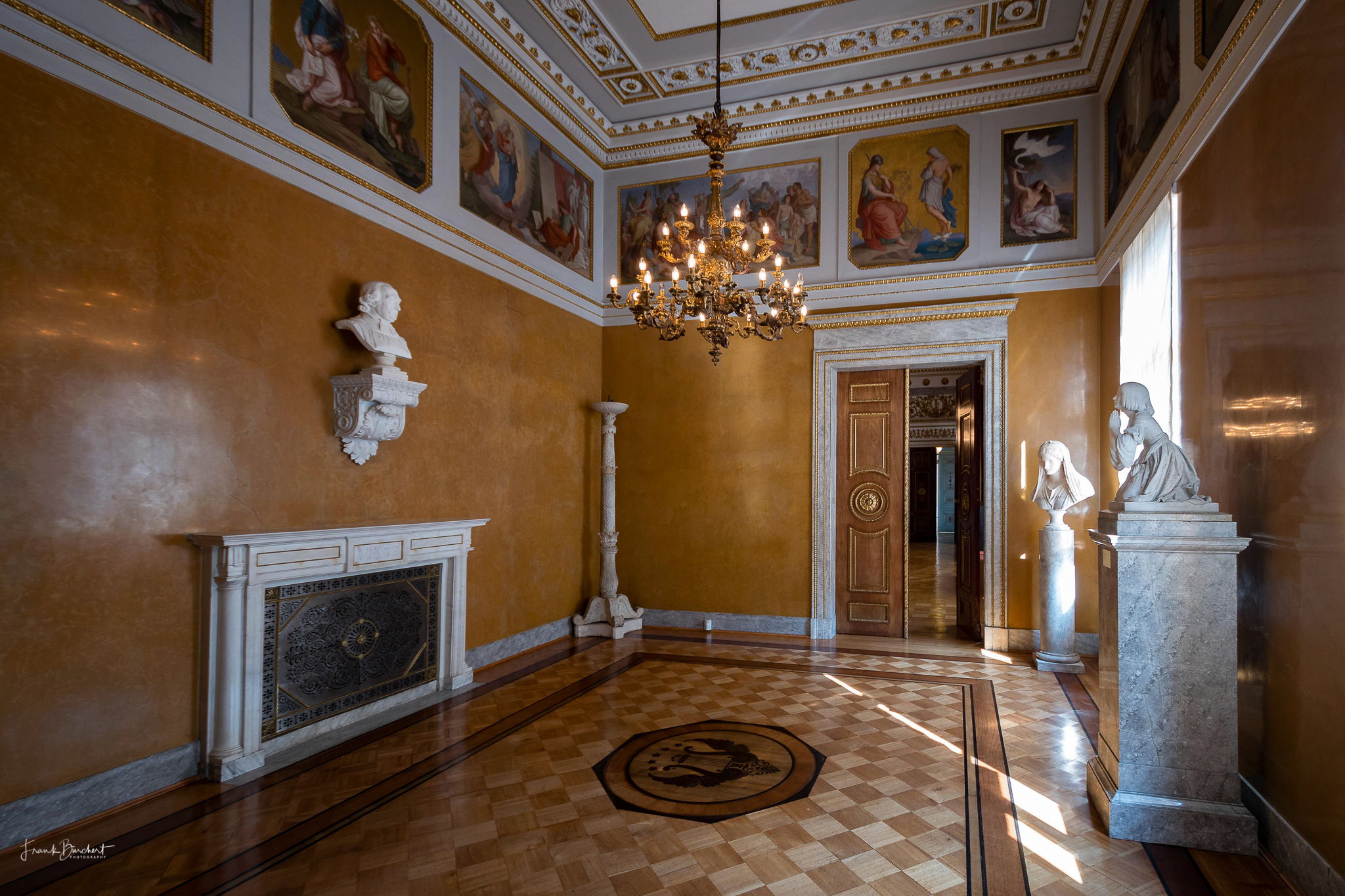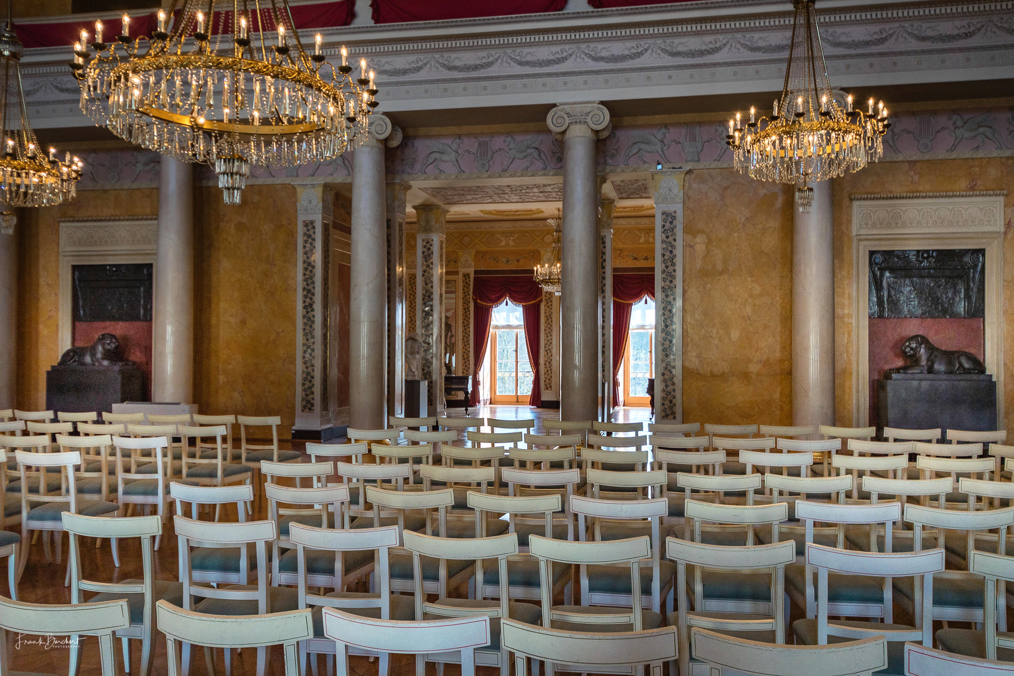 Über das Gentzsche Treppenhaus gelangt man vom Schlosshof über das Entréezimmer fast direkt in den Festsaal. Eine weitere grandiose klassizistische Raumschöpfung, für dessen Ausgestaltung wiederum Goethe für den Architekten Heinrich Gentz einige Ideen ablieferte.