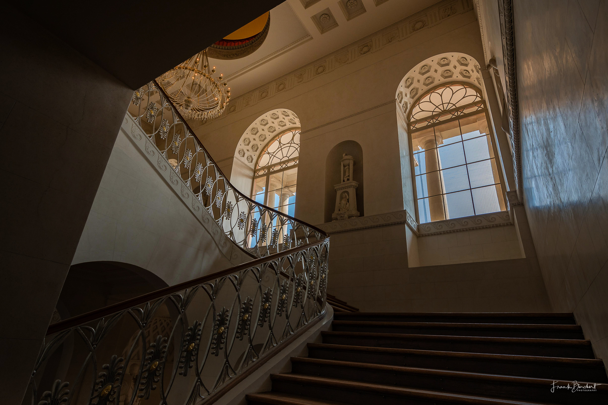 Umgeben von Reliefs, Skulpturen und einem umlaufenden Metopenfries gelangt man vom Erdgeschoss in die Beletage. Besonders beeindruckend ist die vergoldete Kuppel in der Decke des Treppenhauses. Sie repräsentiert die Sonne am Himmel und taucht den Raum in ein goldenes Licht.