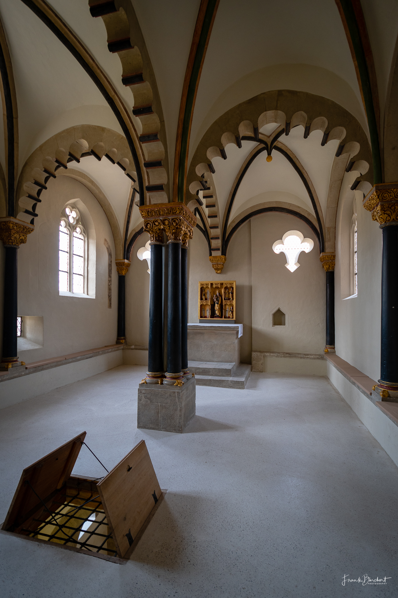 Die Doppelkapelle ermöglichte den Mitgliedern der landgräflichen Familie im Obergeschoss der Messe beizuwohnen, ohne den Raum mit anderen Menschen, die im Untergeschoss versammelt waren, teilen zu müssen. Über eine zu öffnende Luke wurde die Messe ins Obergeschoss sozusagen „übertragen“.